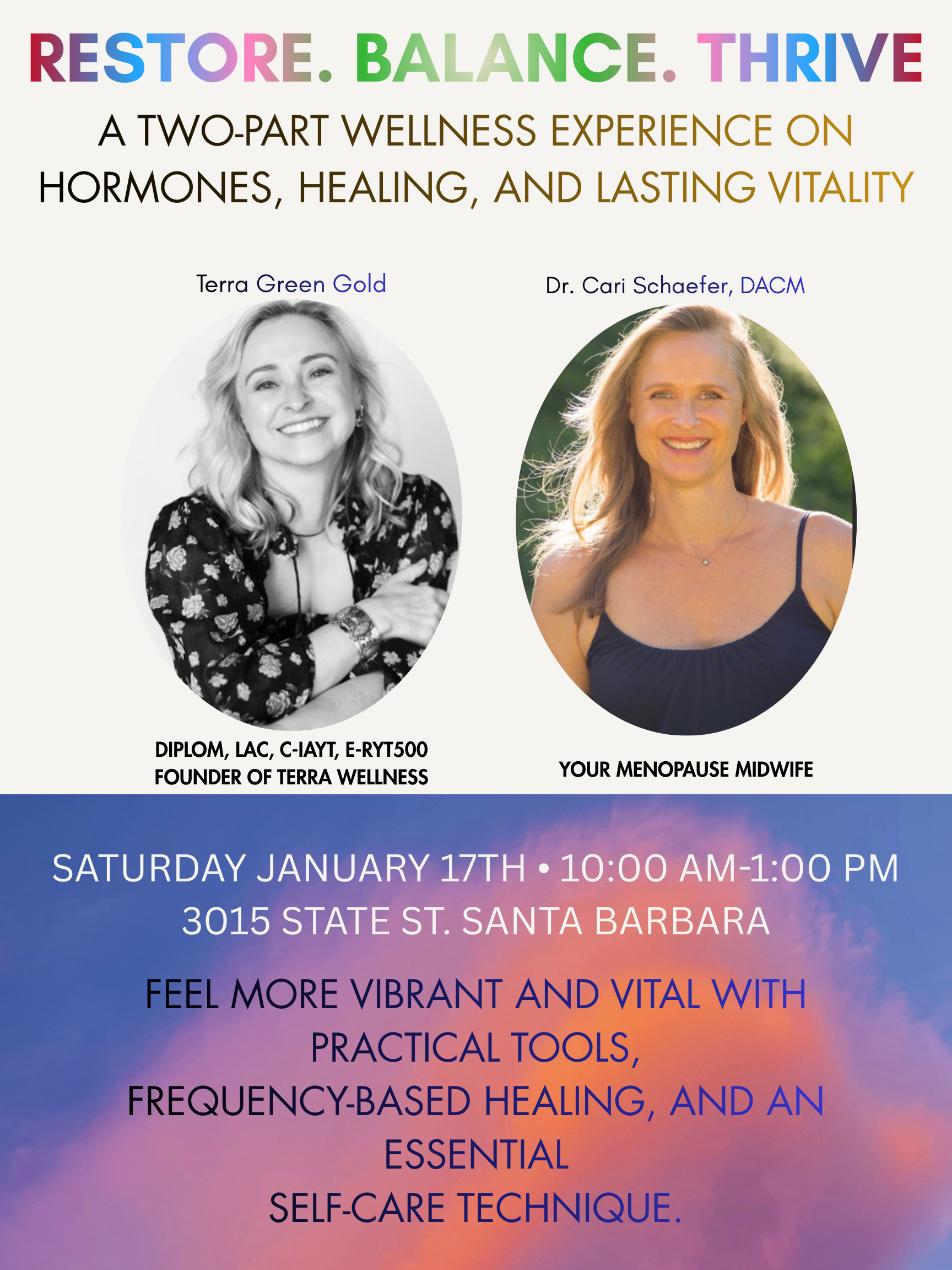 Two powerful practitioners, Dr. Cari Schaefer, DACM (Your Menopause Midwife), and Terra Green Gold, DiplOM, LAc (founder of Terra Wellness), come together to offer a unique experience that speaks to the secrets of hormone harmony, nervous system regulation, and frequency-based healing.